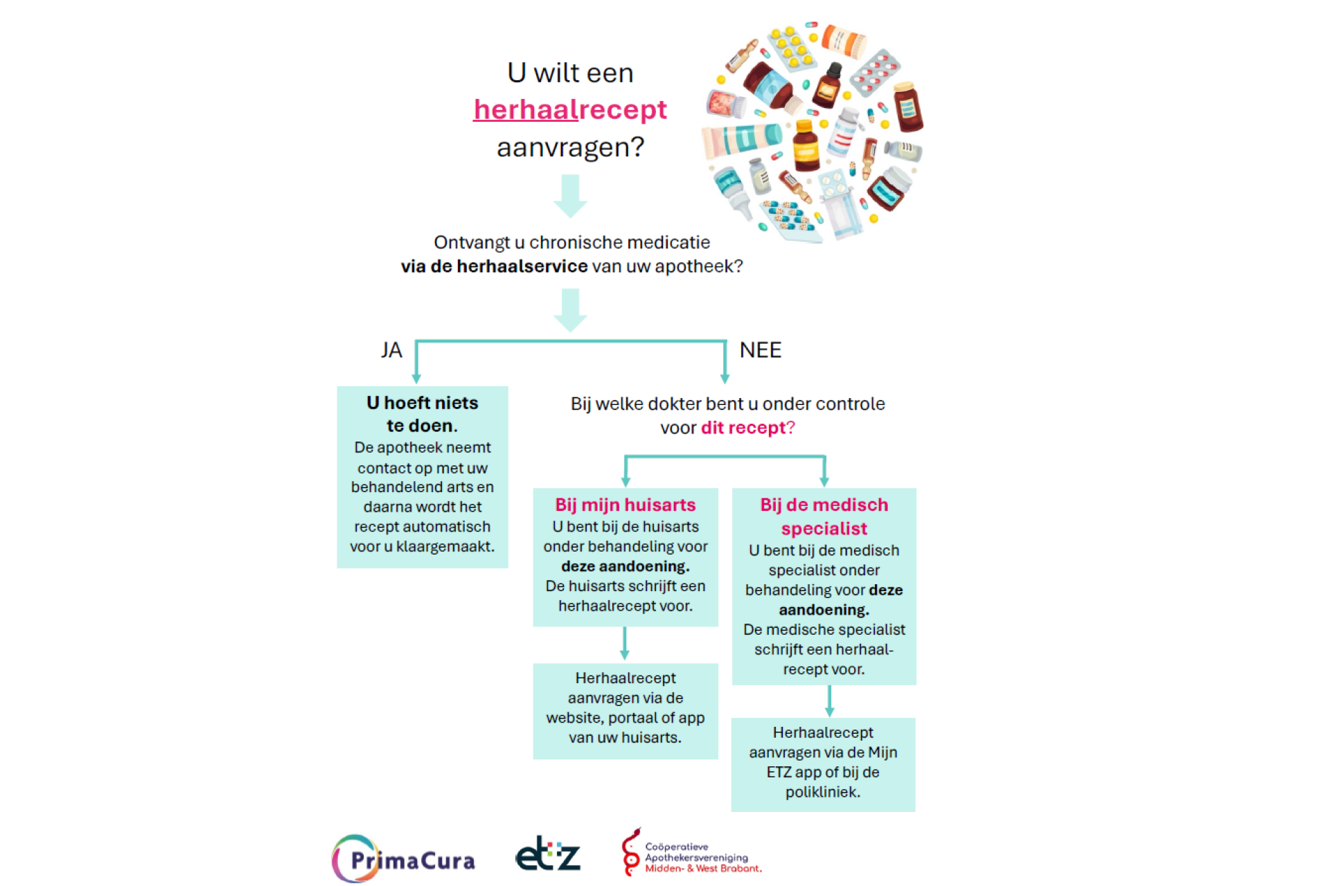Heb je een recept gekregen van je huisarts voor een nieuw medicijn? En heb je dit medicijn meteen nodig? Dan kun je het dezelfde dag nog ophalen bij je apotheek, mits het medicijn op voorraad is. Heb je een herhaalrecept? Dan kun je jouw medicatie na twee dagen ophalen bij je apotheek.